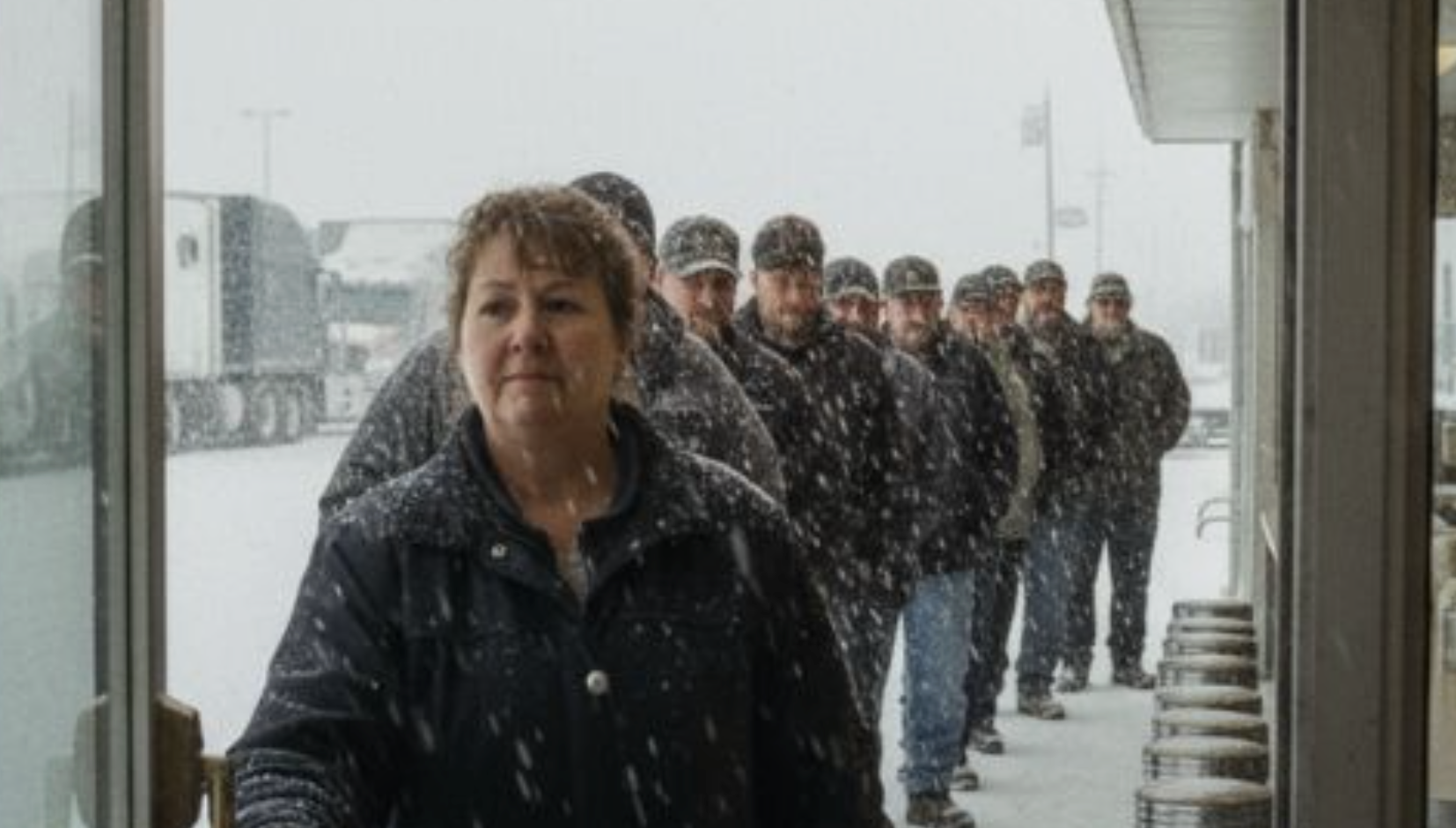 Furtuna a ajuns peste Millstone mai repede decât anticipase oricine. Proprietara unui mic diner a oprit mașina în parcarea deja acoperită de zăpadă, în timp ce fulgii cădeau tot mai des, îngroșând stratul alb de pe asfalt. Nu intenționa să deschidă în acea seară, considerând că drumul era prea periculos pentru clienți și pentru ea. Planul i-a fost însă schimbat în clipa în care farurile a douăsprezece camioane au luminat marginea șoselei, iar siluetele șoferilor, aliniați în frig, au apărut în întuneric.